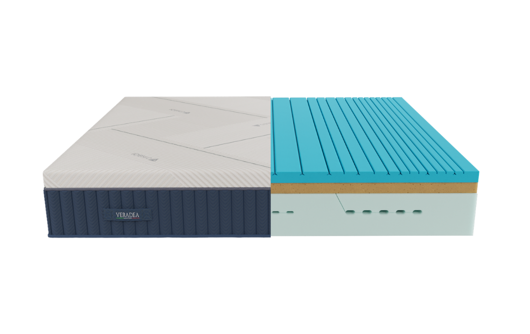 The Veradea Memory Gel Ice mattress is ideal for those seeking firm support across 9 targeted zones, combined with a soft, welcoming surface. The comfort foam provides progressive support, while the high-density base foam, featuring perforations in 3 zones, ensures highly personalized and comfortable support. Thanks to its advanced zoning design, the cooling memory gel foam offers a massaging and adaptive effect. The innovative cover fabric, made with an ice-effect cooling yarn, delivers a pleasantly cool sensation for a uniquely relaxing sleep.