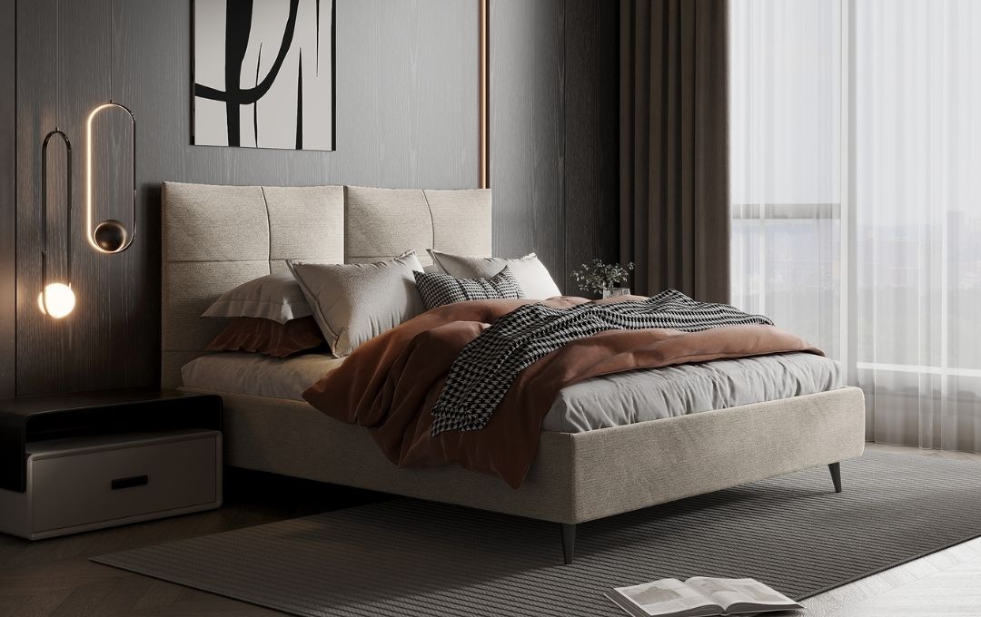 The Viola Veradea upholstered bed stands out for its elegant double-padded headboard panels, designed to enhance comfort and add a refined touch to your bedroom. The geometric stitching creates a soft, harmonious line that makes the bed both visually appealing and inviting. Every detail turns the Viola bed into a true statement piece, perfectly suited for both classic and modern interiors. This model features a spacious storage compartment to meet various needs. It comes with 13 cm high charcoal-colored plastic feet and a lift-up slatted mechanism. A wooden slatted bed base is included to ensure comfort and support.