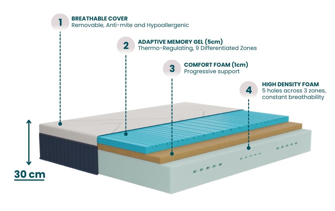 The Veradea Memory Gel Ice mattress is ideal for those seeking firm support across 9 targeted zones, combined with a soft, welcoming surface. The comfort foam provides progressive support, while the high-density base foam, featuring perforations in 3 zones, ensures highly personalized and comfortable support. Thanks to its advanced zoning design, the cooling memory gel foam offers a massaging and adaptive effect. The innovative cover fabric, made with an ice-effect cooling yarn, delivers a pleasantly cool sensation for a uniquely relaxing sleep.